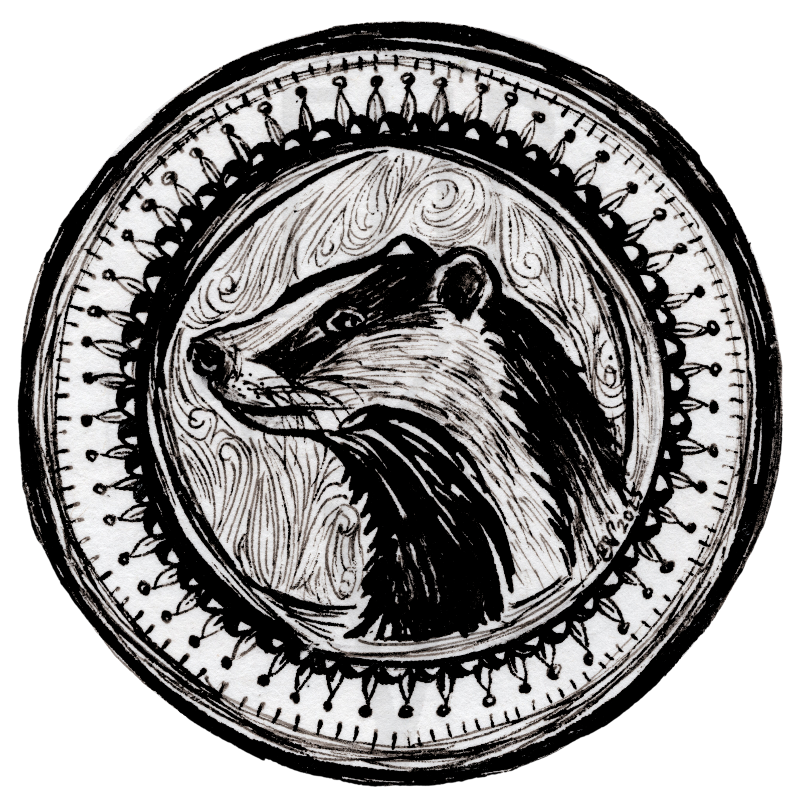 A stately portrait of a badger's profile. Originally done in ink.