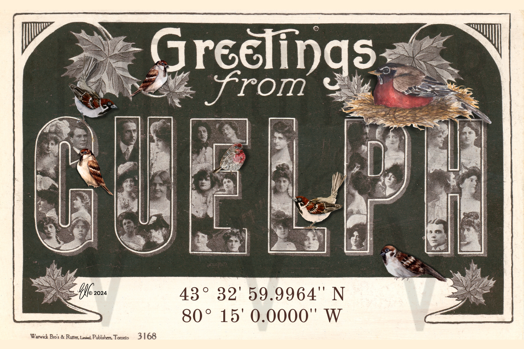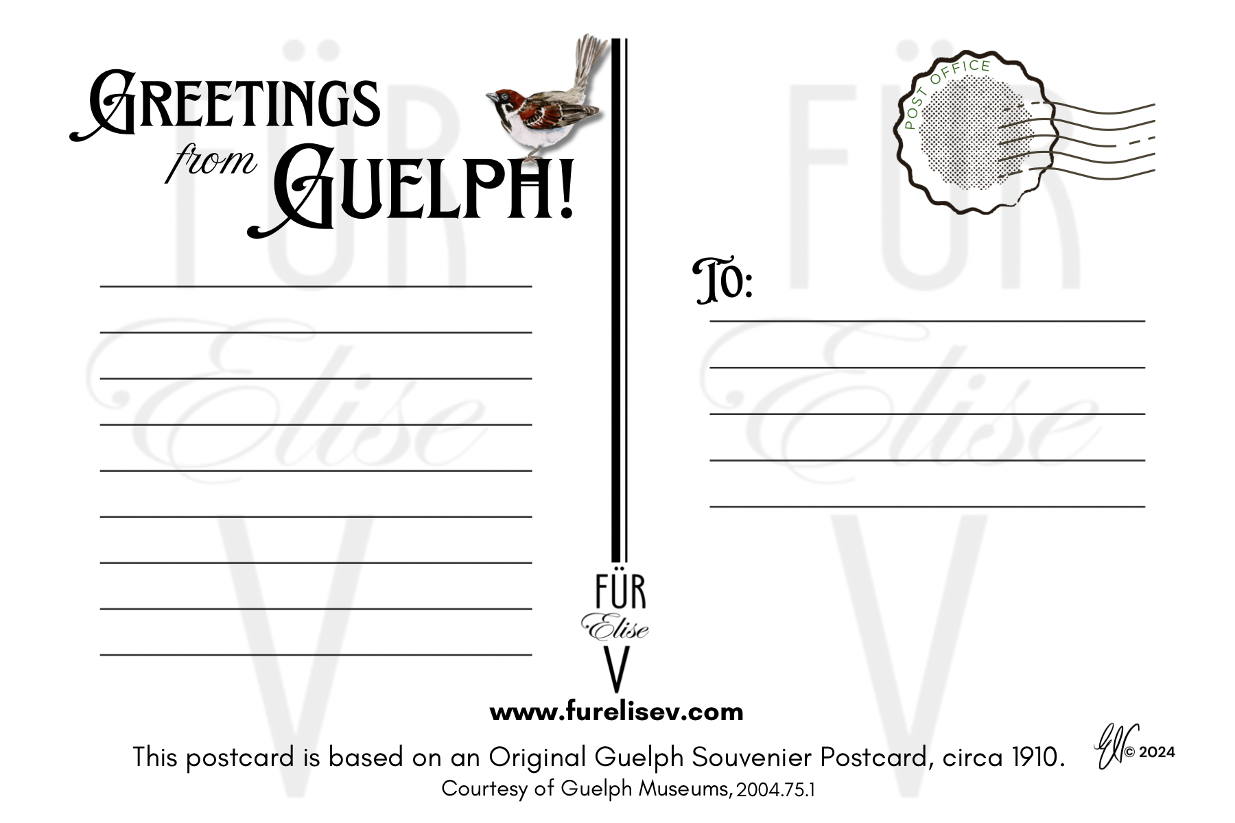 This postcard is based on an Original Guelph Souvenir Postcard, circa 1910, Courtesy of Guelph Museums. A variety of birds are perched throughout, all of which you will see in Guelph!