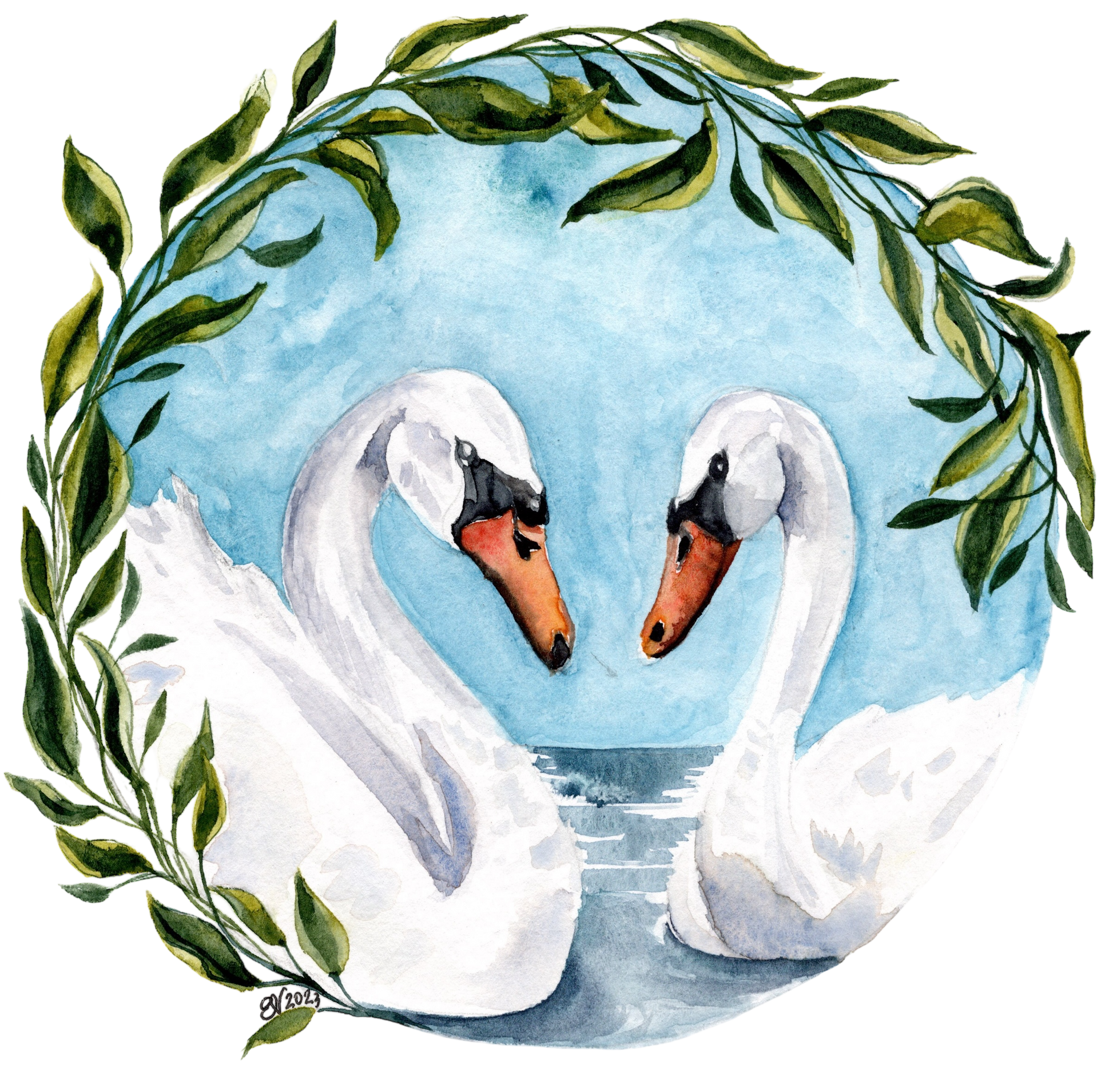 A pair of elegant swans framed in greenery.